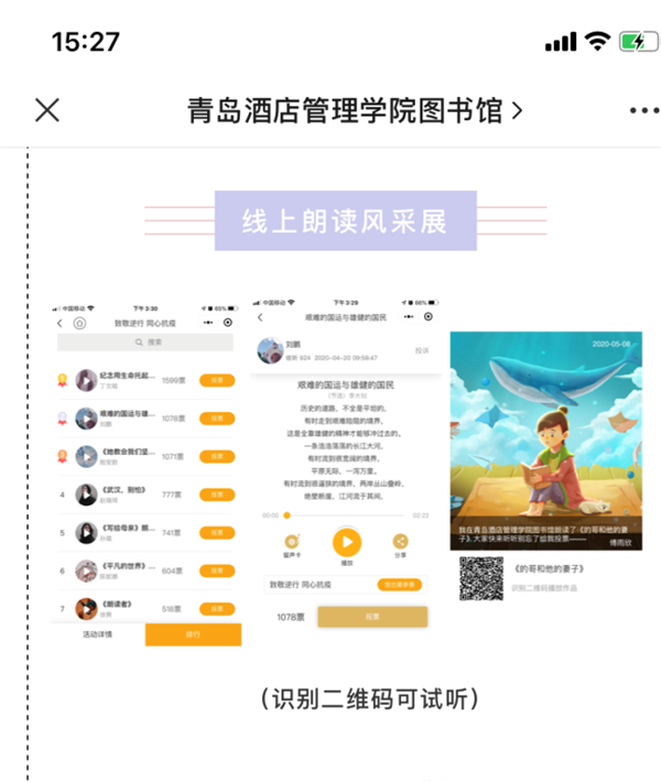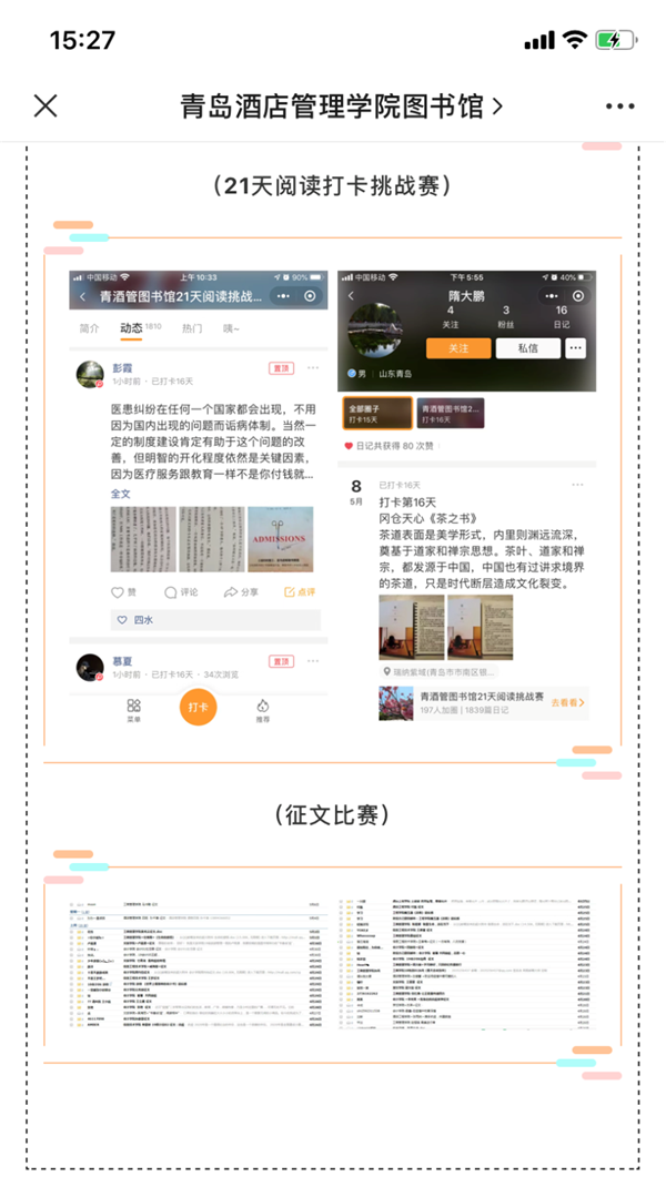 各总支、支部把读书活动作为主题党日活动的重要内容,创新思维,丰富形式,借助各种介质及新媒体平台,通过线上线下相结合的方式,积极组织开展读书沙龙、读书分享会、领读人等丰富多彩的系列活动,打造了“红烛读书会”“读书片刻”等阅读品牌,力求把读书活动激发出来的学习热情转化为推动工作的干劲,实现学习成果的转化。学院图书馆开展了“莫负春光好时节 阅读学习正当时”为主题的读书月系列活动,依托“21天阅读打卡挑战赛”“书香战‘疫’,阅读相伴”征文比赛、线上朗读比赛等活动,充分发挥线上资源、平台的优势,通过开展各类阅读推广活动,提升师生的人文素养。