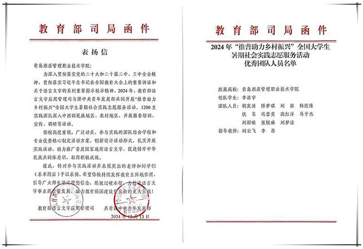 近日,由教育部语言文字应用管理司、共青团中央青年发展部联合开展的2024年“推普助力乡村振兴”全国大学生暑期社会实践志愿服务活动评选结果揭晓,青岛酒店管理职院下设的文旅学院组织赴新疆哈密“百村计划”乡村振兴服务队获评2024年度“推普助力乡村振兴”优秀团队,教育部语言文字应用管理司和共青团中央青年发展部来信表扬,对学校社会实践活动的突出贡献表示充分肯定。