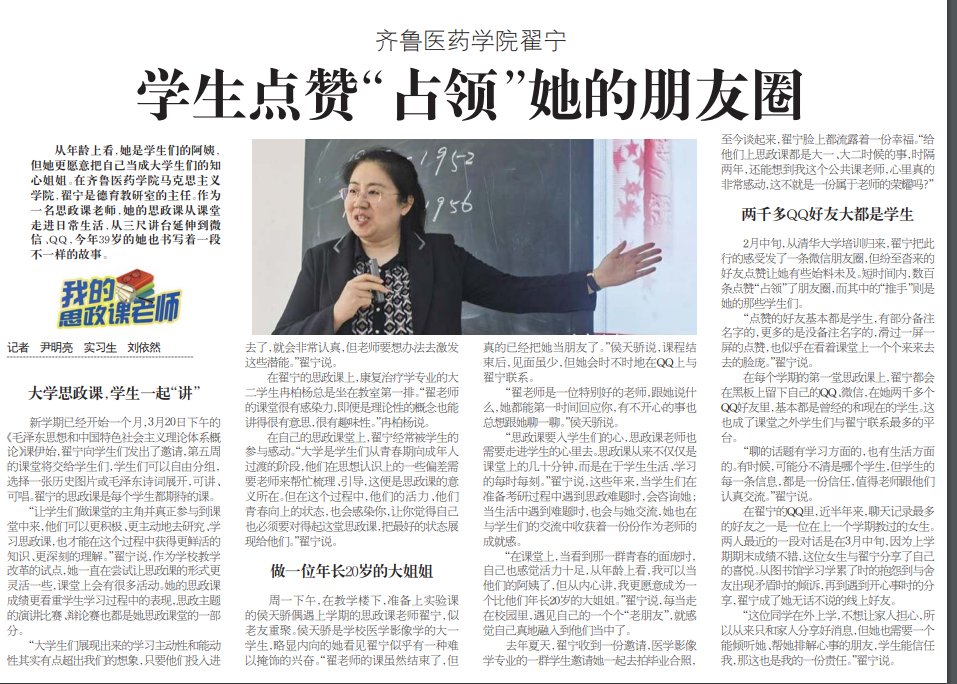 从年龄上看,她是学生们的阿姨,但她更愿意把自己当成大学生们的知心姐姐。在齐鲁医药学院马克思主义学院,翟宁是德育教研室的主任。作为一名思政课老师,她的思政课从课堂走进日常生活,从三尺讲台延伸到微信、QQ,今年39岁的她也书写着一段不一样的故事。