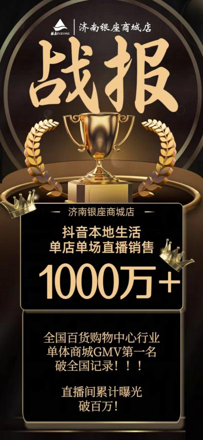 近日,银座济南商城店组织开展“27周年庆”抖音本地生活专场团券大型直播活动,直播专场曝光量破百万,销售额超1000万元,破抖音本地生活百货购物中心行业单店单场直播GMV全国纪录。