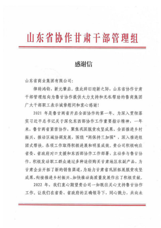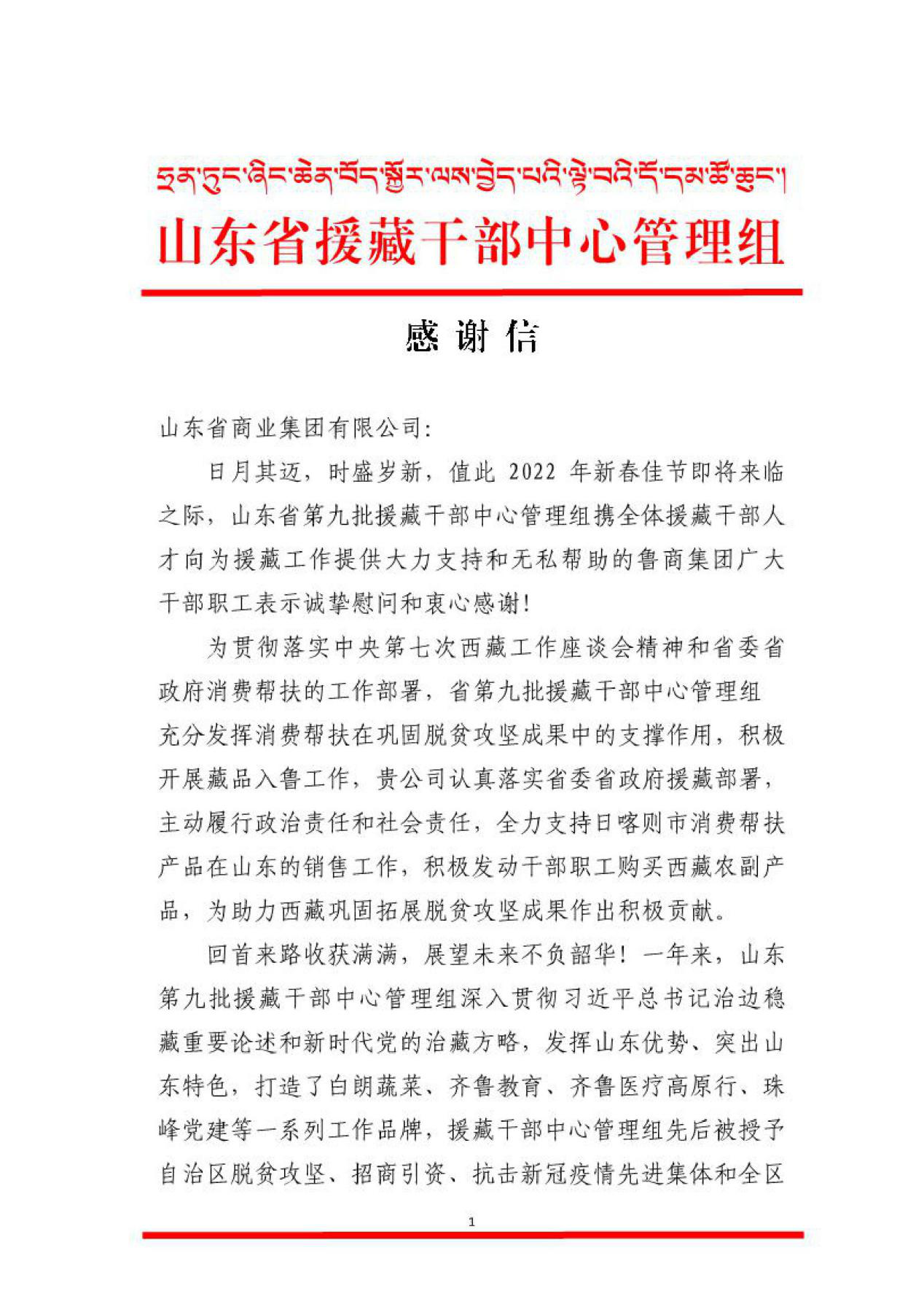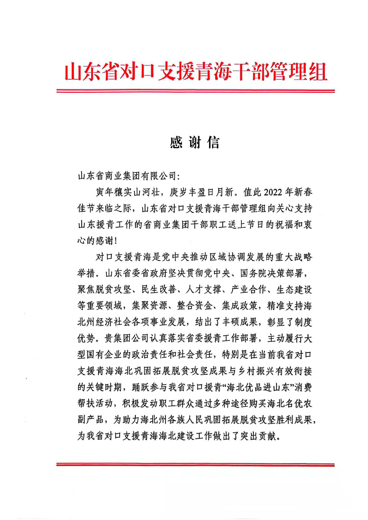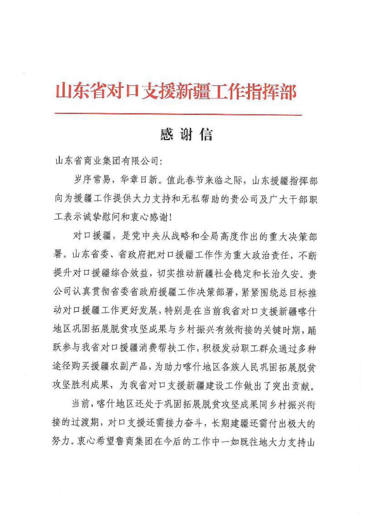 近日,世界杯中国官网分别收到山东省对口支援新疆工作指挥部、山东省第九批援藏干部中心管理组、山东省对口支援青海干部管理组、山东省协作重庆干部管理组、山东省协作甘肃干部管理组发来的感谢信,对集团近年来在对口支援和东西部协作工作中给予的支持和帮助表示肯定和感谢。