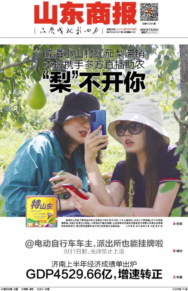今年以来,山东商报已经累计推出了10多场“特山东”品牌活动,推介了包括平阴泉水樱桃、商河仁凤西瓜等品牌在内的农产品。7月28日至31日,顶着高温酷暑,山东商报记者团队从济南赶赴威海乳山崖子镇枣林村、潍坊安丘市凌河镇的百鹅疃村,在田间地头做了两场直播带货活动,为当地滞销的特色农产品红茄梨、牛奶小芋头和红芽嫩姜找出路。本次活动中,山东商报联合多家媒体共同出击,帮助当地农民售出总计20万斤特色农产品。