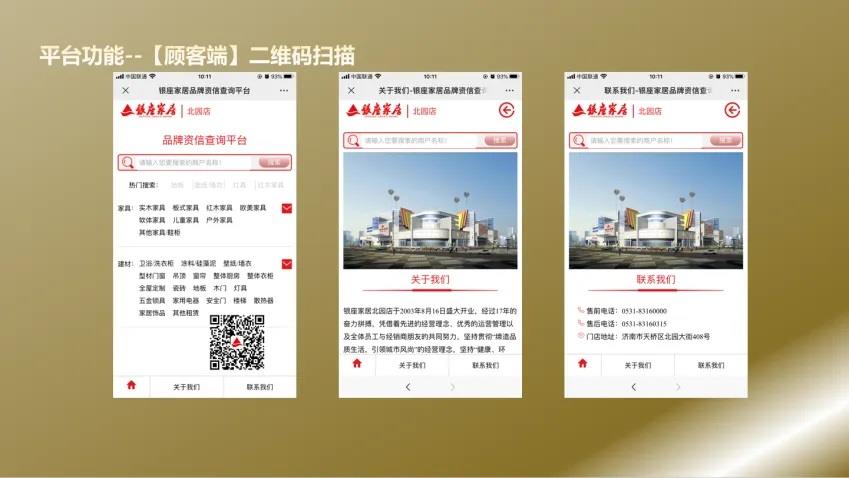 为优化守信经营氛围及健全商户信用管理体系,由营运团队自主研发搭建“商户信用查询平台”,该平台通过顾客前端与管理后端两个端口管理支撑实现四个功能,前端消费者可通过展厅二维码扫描随时查看品牌经营资质,打消顾虑实现信用公开可视化;后端设定提前30天预警功能实现授权资质和工厂资质预警管理自动化,多维度有效管理控制商户风险,引导商户由被动管理走向自助管理。